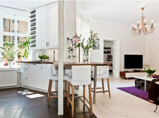 小戶型里,多一張柜子都顯擁擠,所以不會考慮用到收納柜隔斷客廳和餐廳,但是可以用盆栽、沙發(fā)凳等。既能裝飾空間,又起到功能區(qū)間的分割作用。